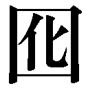 会意兼形声。化は、たった人がしゃがんだ形に姿をかえたことを示す会意文字。囮は「囗(かこい)+音符化」で、姿をかえて相手をだますおとりを、かこいの中に入れたことをあらわす。