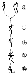 会意。先は「足+人の形」で、跣セン(はだしの足さき)の原字。足さきは人体の先端にあるので、先後の先の意となった。