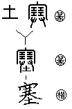会意兼形声。「宀(やね)+工印四つ+両手」の形が原形。両手でかわらや土を持ち、屋根の下の穴をふさぐことを示す会意文字。塞はそれを音符とし、土を加えた字で、すきまのないように、かわらや土をぴったりあわせつけること。