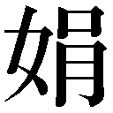 会意兼形声。右側の字(音ケン・エン)は、まるくくびれた虫のこと。娟はそれを音符とし、女を加えた字で、くねくねとして身ごなしの軽い意を含む。
