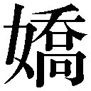 会意兼形声。喬キョウは、高の字の先端がなよなよと曲がった形で、曲線状にしなる意を含む。嬌は「女+音符喬」で、女がしなやかにからだをくねらせること。