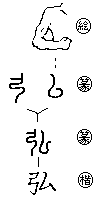 会意兼形声。厶コウは、ひじをひろく張り出したさま。肱コウの原字。弘は「弓+音符厶」で、弓をじゅうぶんに張ることを示す。