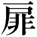{名}とびら。両側に開く二枚とびら。「柴扉サイヒ(そまつな木のとびら)」「丹扉タンピ(宮中の朱塗りのとびら)」