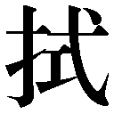 【拭】 9画 部  区点=3101 16進=3F21 シフトJIS=9040 《音読み》 ショク/シキ〈sh〉 《訓読み》 ぬぐう(ぬぐふ) 《意味》 {動}ぬぐう(ヌグフ)。ふいて汚れをとる。また、きれいにする。「払拭フッショク」「拭涙=涙ヲ拭フ」 《解字》 会意兼形声。式ショク・シキとは「弋(くい)+工」からなり、棒杙ボウグイで工作すること。のち人工を加えて整える意となる。拭は「手+音符式」で、人工を加えてきれいにすること。 《単語家族》 飾ショク(人工を加えてかざる)と同系。 《熟語》 →熟語 →下付・中付語