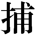 {動}とらえる(トラフ)。手を相手にぴたりと当てて、つかまえる。〈類義語〉→逮。「逮捕」「捕魚為業=魚ヲ捕ラフルヲ業トナス」〔→陶潜〕