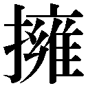 ヨウス{動}いだく。両腕で、胸の前にだきかかえる。また、だいたようにすっぽりと包む。取り囲む。おおう。「抱擁」「擁蔽ヨウヘイ」「擁盾入軍門=盾ヲ擁シテ軍門ニ入ル」〔→史記〕「雪擁藍関馬不前=雪ハ藍関ヲ擁シテ、馬前マズ」〔→韓愈〕