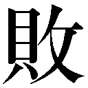 {動}やぶれる(ヤブル)。戦いや試合でまける。〈対語〉→勝。〈類義語〉→敝ヘイ。「東敗於斉=東ノカタ、斉ニ敗ル」〔→孟子〕