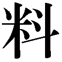 {動}はかる。ますに入れて、穀物や液体の量をはかる。転じて広く、おしはかる。〈類義語〉→量・→計・→測。「予料(=予想)」「逆料(先手をうって予想する)」「料理(もと、はかって処理すること)」