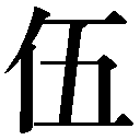 会意兼形声。「人+音符五ゴ」で、五人の意をあらわす。▽証文や契約書で、改竄カイザンや誤解をさけるために、「五」のかわりに使うことがある。