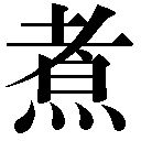 会意兼形声。者は、こんろの上で木を燃やすさまを描いた象形文字で、火力を集中して火をたくこと。のち、助辞に専用されたため、煮がつくられその原義をあらわすようになった。「火+音符者」。暑(熱が集中してあつい)と縁が近い。