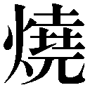 {動}やく。やける(ヤク)。炎や煙を高くあげてやく。もえる。〈類義語〉→焚フン・→燃。「燃焼」「非秦記皆焼之=秦ノ記ニアラズンバミナコレヲ焼ケ」〔→史記〕