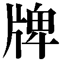 {名}ふだ。字や目じるしを書いて標識・掲示として用いるふだ・かんばん。「招牌ショウハイ」「牌示ハイジ」