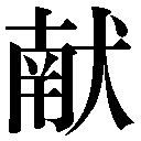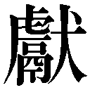 会意兼形声。獻の左側の字(音ケン)は「虎+鬲(三本の袋足のついた煮たきする器)」の会意文字で、虎トラなどの飾りのついたりっぱな食器。獻はそれを音符とし、犬を加えた字で、犬の肉を食器に盛ってさしあげることを示す。高くささげる、下から上へあげるの意を含む。