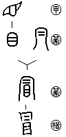 会意兼形声。上部は、=印(物)の上に冂型のおおいをかぶせたことを示す。冒はそれを音符とし、目を加えた字で、目をおおい隠すことを示す。
