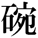 【碗】 13画 石部  区点=4750 16進=4F52 シフトJIS=9871 《音読み》 ワン〈wn〉 《意味》 {名}まるくてまんなかのくぼんだ器。わん。〈同義語〉→椀。 《解字》 会意兼形声。宛エンは、まるい、まるくくぼむの意を含む。碗は「石+音符宛」。 《単語家族》 椀腕(まるくまがる手首)と同系。 《熟語》 →下付・中付語