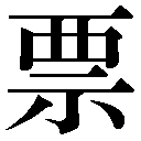 {名}軽くて目だつ札フダ。目じるしの札。転じて、きっぷ・証券・紙幣などの札。〈類義語〉→標(目じるし)・→券。「票簽ヒョウセン(書類につけて付箋フセンとする札)」「車票(乗り物のきっぷ)」「鈔票ショウヒョウ(紙幣)」