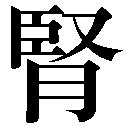 会意兼形声。上部の字は「臣(うつぶせた目)+又(手。動詞の記号)」からなり、伏せた臣下のようにからだをかたくすること。堅(かっちりとかたい)の原字。腎はそれを音符とし、肉を加えた字で、精力を蓄えてからだをかっちりと引きしめる内臓。