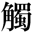 会意兼形声。蜀ショクは、目の大きいくわ虫を描いた象形文字で、つんと葉にくっつく虫。觸は「角(つの)+音符蜀」で、つのをつんとおしあててくっつけること。→蜀