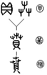 会意兼形声。「貝+音符奔ホン(ふきでる、ふくれる)の略体」で、おおきくふくれたきれいな貝。はなやかでおおきい意をふくむ。また奔ホンに通じて、勢いよくふき出る、かけまわるなどの意をあらわす。