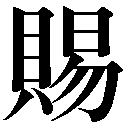 会意兼形声。「貝+音符易イ・シ(おしのばす、おしやる)」で、自分の前にある物を相手の前におしやること。転じて、たまわる意となった。