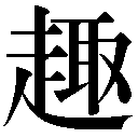 {名}おもむき。心の向くところ。人をそちらに向かわせるおもしろさ。ふぜい。「趣向シュコウ」「有趣=趣有リ」