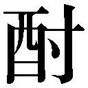 会意。「酉(さかつぼ)+人のひざまずいた姿」で、人が酒つぼのそばにくっついて離れないさまを示す。
