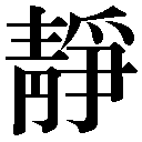 {形・動}しずか(シヅカナリ)。しずめる(シヅム)。しずまる(シヅマル)。しんとすみわたった。雑音や動きがなくしずまりかえったさま。しんとする。動かない。〈対語〉→動・→噪ソウ(さわがしい)・→乱。「安静」「静寂」「鎮静」