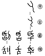 会意兼形声。コ型にえぐる小刀の形を描いた字が原字。それに口(あな)を加え、舌カツ(舌ゼツと別字)となる。刮は「刀+音符舌カツ」で、刀で穴をえぐること。