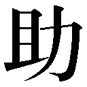 会意兼形声。且は、積み重ねたさまを描いた象形文字。助は「力+音符且シャ・ショ」で、力の足りないとき、その上にプラスして力をそえてやること。→且