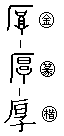 会意。厚の原字は、高の字をさかさにした形。それに厂(がけ、つち)を加えたものが厚の字。土がぶあつくたまったがけをあらわす。上に高く出たのを高といい、下にぶあつくたまったのを厚という。基準面の下にぶあつく積もっていること。