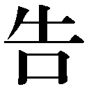 {動}つげる(ツグ)。訴える。おかみに申し出る。「告訴」「告発」「不告姦者、腰斬=姦ヲ告ゲザル者ハ、腰斬ス」〔→史記〕