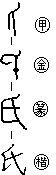 象形。氏はもと、先の鋭いさじを描いたもので、匙シ(さじ)と同系。ただし古くより伝逓の逓テイ(つぎつぎと伝わる)に当て、代々と伝わっていく血統をあらわす。