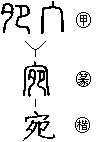 会意兼形声。下部の字(音エン)は、人がまるくからだをくねらせたさま。宛はそれを音符とし、宀(やね)を加えた字で、おおいの下でからだをまるくかがめることを示す。