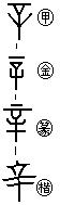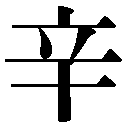{名}かのと。十干ジッカンの八番め。▽五行では、庚とともに金に当てる。「かのと」は、「金の弟」の意。順位の第八位も示す。「辛亥シンガイ」