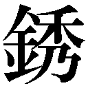 {動・名}さびる(サブ)。さび。鉄などの表面が酸化して細く浮きあがる。また、さびて表面にできたもの。「銅銹ドウシュウ」