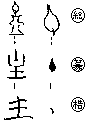 象形。丶は、じっと燃えたつ灯火を描いた象形文字。主は、灯火が燭台の上でじっと燃えるさまを描いたもので、じっとひと所にとまるの意を含む。