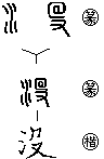 会意兼形声。沒の右側は「うずまく水+又(手)」の会意文字で、うずまく水中にからだをもぐらせて潜水することを示す。沒は、その原義をより明らかにあらわすため水をそえた字。