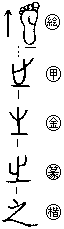 象形。足の先が線から出て進みいくさまを描いたもの。進みいく足の動作を意味する。先(跣センの原字。足さき)の字の上部は、この字の変形である。「これ」ということばに当てたのは音を利用した当て字。是シ・コレ、斯シ・コレ、此シ・コレなども当て字で之シに近いが、其