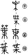 会意兼形声。下部の字は、三枚の葉が木の上にある姿を描いた象形文字。葉はそれを音符とし、艸を加えた字で、薄く平らな葉っぱのこと。薄っぺらなの意を含む。