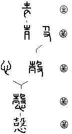 会意兼形声。左上は、堅い貝がらをひもでつるした姿。殼カク(=殻。堅いから)の原字。それに動詞記号の殳印を添えた字(音コク・カク)は、固める、堅い物をたたくなどの意をあらわす。愨はそれを音符とし、心を加えた字で、堅苦しくまじめな心のこと。