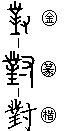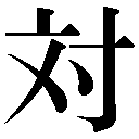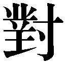 会意。對の左側は業の字の上部と同じで、楽器を掛ける柱を描いた象形文字。二つで対をなす台座。對は、その右に寸(手。動詞の記号)を加えたもので、二つで一組になるようにそろえる。また、二つがまともにむきあうこと。