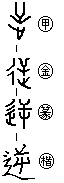 {動・形}さからう(サカラフ)。たがう(タガフ)。→の方向に対して、反対に←の方向にでる。そむく。体制や物事の順序にさからっている。〈対語〉→順。「反逆(叛逆)」「倒行逆施トウコウギャクシ(道理にそむいたことをする)」「逆天者亡=天ニ逆ラフ者ハ亡ブ」〔→孟子〕
