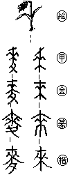 {名}むぎ。紀元前十世紀ごろ、中央アジアから周(今の陝西センセイ省)にもたらされた植物。▽周の人々は、これを神のもたらした穀物として珍重し、来ライと呼んだ。「大麦」「燕麦エンバク(からすむぎ)」