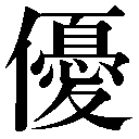 会意兼形声。憂の原字は、人が静々としなやかなしぐさをするさまを描いた象形文字。憂は、それに心を添えた会意文字で、心が沈んだしなやかな姿を示す。優は「人+音符憂」で、しなやかにゆるゆるとふるまう俳優の姿。▽「説文解字」に「饒ユタかなり」とあるのはその派生義である。→憂