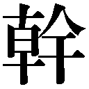 {名}みき。木の中心となる部分。また、転じて、広く物事の中心や本筋のこと。〈対語〉→枝。「躯幹クカン(胴体)」「幹部」「箭幹センカン(矢の棒)」