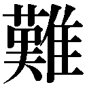 {形}かたい(カタシ)。むずかしい。やりづらいさま。手におえない。うまく物事が進まない。▽平声に読む。〈対語〉→易。「困難」「難問」「為君難=君タルコト難シ」〔→論語〕