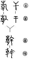会意兼形声。左側は日がのぼるような強い力を示し、乾ケンの原字。幹は、それに音符干(太い棒)を添えたもの。中心となる丈夫なみきのこと。干の代わりに木を加えて書く字体もある。