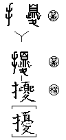 会意兼形声。右側の部分はもと人の子どもの形に似たさるを描いた象形文字。狃ジュウとも書き、人にじゃれつくさるのこと。擾は、もとそれを音符とし、手を加えた字で、人になれたさるのように、うるさくじゃますること。のち音符を憂に書き誤り、擾と書くようになった。