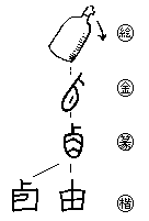 象形。酒や汁をぬき出す口のついたつぼを描いたもの。また、…から出てくるの意を含み、ある事が何かから生じて来たその理由の意となる。