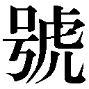 会意。号は「口(くち)+屈曲して出るさま」で、大きな口をあけ、声をかすらせてどなる意を示す。號は「虎トラ(とらのほえるような)+音符号」の会意兼形声文字で、とらのような太い声でさけぶこと。